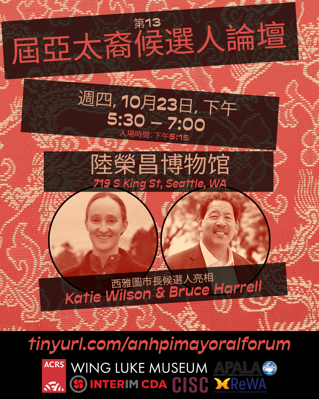 Featuring incumbent Mayor Bruce Harrell and candidate Katie Wilson. Moderated by Sam Prudente. Live translation will be available in Cantonese and Mandarin.